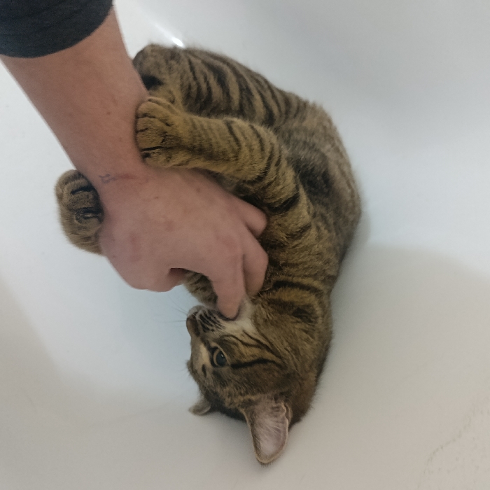 - "A brown tabby cat is lying on its back in a white bathtub, with its head near the bottom of the frame" by FM-fpfCx2, licensed under CC BY 4.0