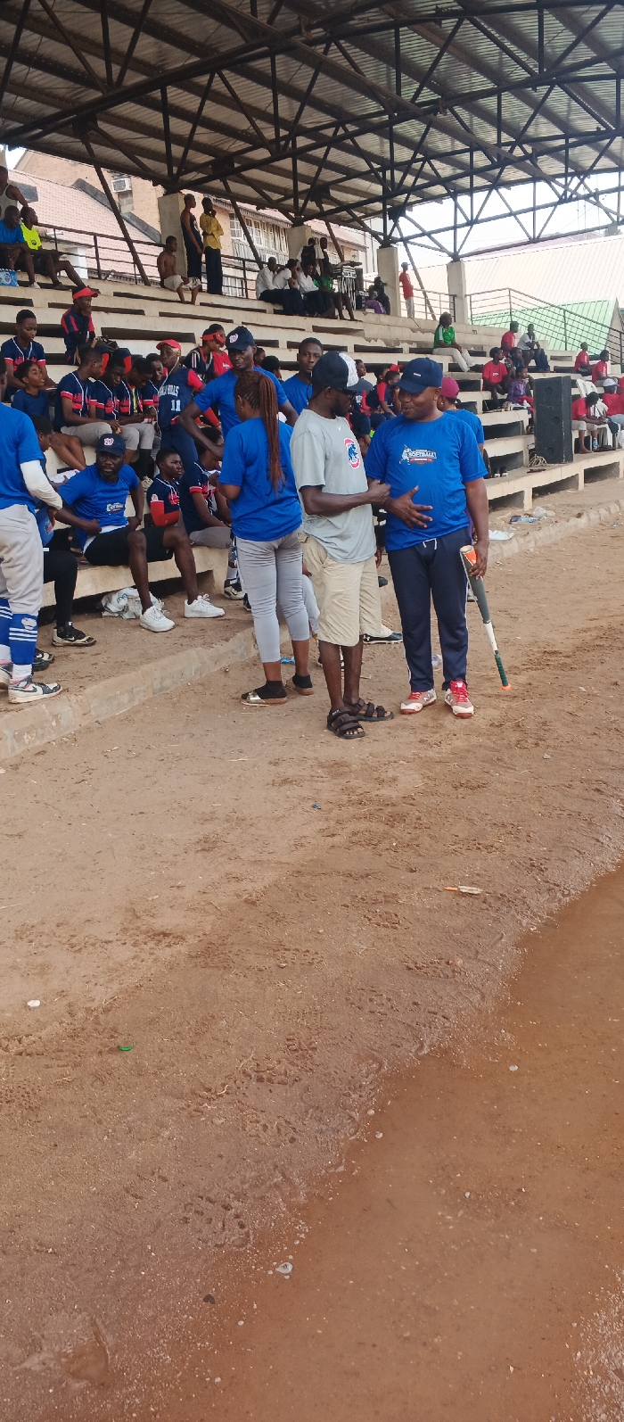 The image depicts an outdoor scene at a sports stadium or complex in Lagos, Nigeria. The primary focus is on a group of approximately five adults standing on a reddish-brown dirt field in the foreground, with numerous other individuals occupying tiered concrete bleachers behind them. In the immediate foreground, a male on the far right, wearing a blue t-shirt emblazoned with "LAGOS SOFTBALL," dark blue athletic pants with a white stripe, and red and white sneakers, holds a white and green baseball bat in his right hand. He is gesturing with his left hand while facing and conversing with another male. This second male wears a light grey t-shirt featuring a blue and red emblem, khaki shorts, and dark sandals, topped with a dark baseball cap with a white front panel. To their left, a female stands wearing a blue t-shirt, light grey leggings, and dark sandals, with her dark hair pulled back. Partially obscured to her left are two additional males in blue t-shirts and dark pants, one wearing white athletic shoes. Behind this foreground group, approximately 20-25 individuals are seated or standing on multi-tiered concrete bleachers. Many, primarily males, wear matching navy blue and red striped jerseys with "LAGOS BULLS" text and numbers (e.g., "11"), indicating team affiliation. Some also wear baseball caps. Other spectators in the stands are dressed in various casual attires. A black speaker box is visible on the lower tier of the bleachers to the right. The entire area is covered by a large, open-air stadium roof constructed with a black metal truss framework supporting corrugated metal sheeting. The ground is a dirt or sand playing surface, exhibiting areas of dampness and muddy water, particularly a small puddle in the lower right foreground. Small pieces of debris, including a green bottle cap and a white object, are scattered on the dirt. In the background, beyond the upper section of the bleachers, an older multi-story building with a red-tiled roof, light-colored walls, and multiple prominent white-framed windows is visible, alongside another structure with a green corrugated roof further to the right. The central interaction involves the two males in the foreground engaged in conversation, one gesturing while holding a bat. The surrounding individuals on the field and in the stands appear to be observing or awaiting instructions, suggesting a team gathering, practice, or an interval during a sporting event.