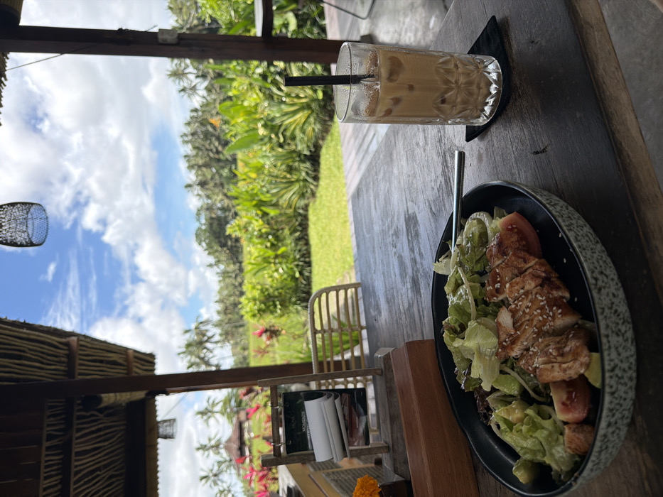 A table is set with a salad of greens, chicken, and tomato in a speckled bowl with a fork. Beside it, a glass of iced coffee with a straw rests on a dark coaster. The view beyond features lush green trees and foliage. The table is under a partially covered structure with a woven lamp hanging from the ceiling. A small wicker chair is visible between the table and the greenery. The sky is blue with scattered clouds.