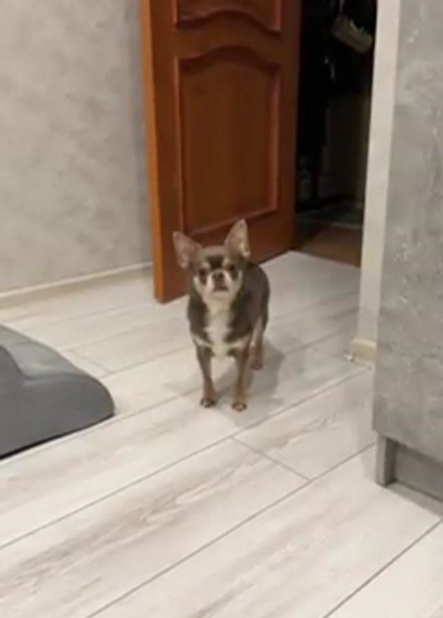 small, brown and white Chihuahua standing on a light-colored wood-look floor. The dog is facing the camera, then turns its head to the left. Behind the dog is a slightly open brown wooden door. To the left of the dog is a gray dog bed, and in the foreground are green Crocs. The walls are light gray. There is a gray kitchen cabinet on the right side of the frame. The closet behind the brown door is dark, but some clothing can be seen.