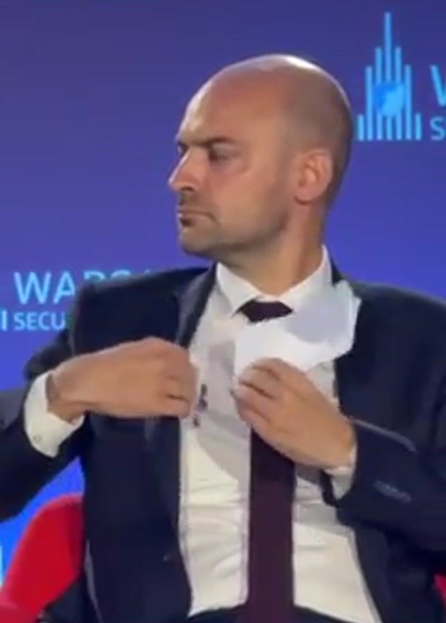 A man is sitting in a red chair at a formal event, wearing a dark suit, white collared shirt, and dark tie. He is holding a white note card. He has fair skin and is balding. He puts the card into the inside pocket of his suit jacket, glances to his left, then pulls the card out of the pocket again. In the background is a blue sign that says "Warsaw Security Forum."