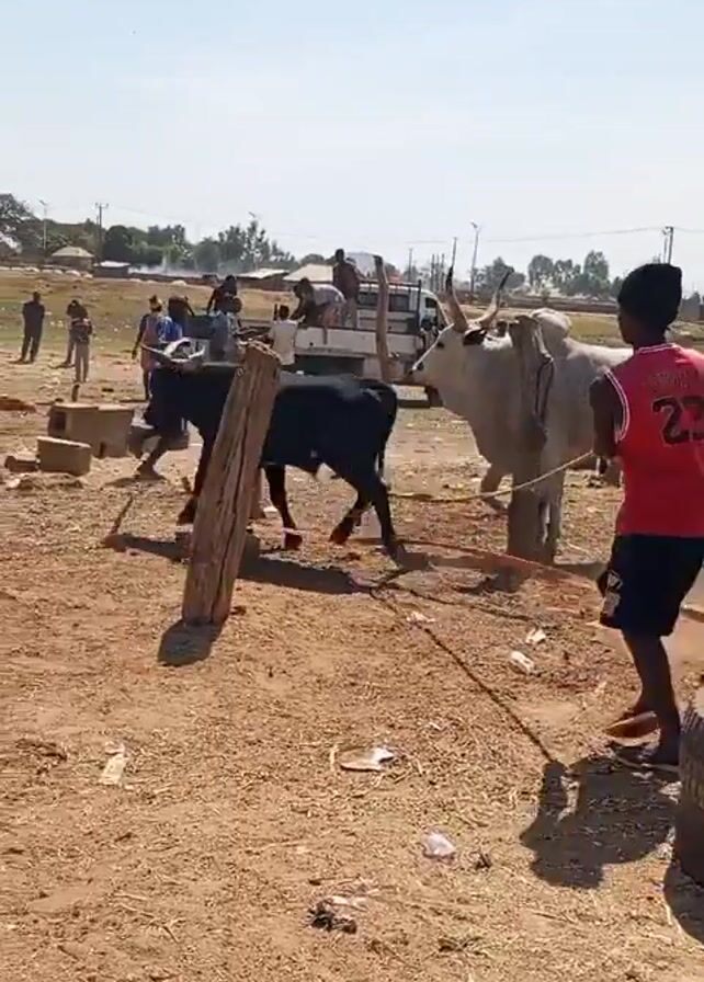 n outdoor cattle auction or market. The ground is brown dirt, with wooden posts and logs scattered around, and a large group of people is visible in the background. One man in a red jersey and black shorts is holding a rope attached to a black bull. Another large white bull with long horns stands nearby. Several people are standing on a flatbed truck in the background. Other cattle are tethered to posts. The weather is sunny and the sky is clear.