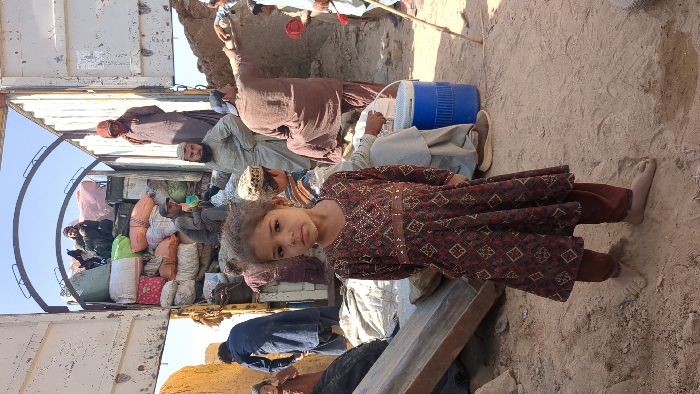The image depicts an outdoor, dusty, sunlit scene in Quetta City Tehsil, Pakistan, featuring multiple individuals and a heavily loaded vehicle. In the foreground, a young girl, approximately 5-7 years old, with dark hair and eyes, stands barefoot, facing the camera with a neutral expression. She wears a long-sleeved, patterned dark brown dress over maroon trousers, with her hands clasped behind her back. In the midground and background, an open-backed truck or trailer is heavily laden with numerous fabric-wrapped bundles, sacks, and luggage items of various colors, indicating a significant amount of personal belongings. Several men are present around and on the truck. One man is seated atop the loaded items inside the truck bed. Another man sits on the ground near the truck's rear, while a man with a beard stands nearby, hands on hips, looking right. Another man stands to the right of the truck. To the left of the frame, a man in dark clothing bends near a mud-colored structure. To the right, another man, wearing a brown traditional outfit and a blue cap, stands facing away from the camera, gesturing with his arm towards a pile of debris or a structure. A man is seated on the ground next to a blue and white water cooler. Partially visible on the far right, another man holds a wooden stick. The ground is dry earth or sand with scattered debris, and parts of rudimentary mud-colored structures are visible on the left and right sides of the frame. The sky is clear and blue, suggesting bright daylight.
