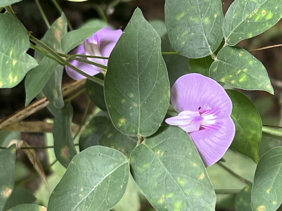 The image displays a close-up view of a plant within a vegetated environment in Logba Adzakoe, Ghana. The primary subjects are two light purple flowers and numerous green leaves. The most prominent flower, situated in the lower-middle frame, is approximately 5 centimeters wide, exhibiting a bilateral symmetry typical of a pea-family flower. Its central structure features distinct white and magenta-pink vertical striations. A small, dark-bodied insect, approximately 2-3 millimeters in length, is visible on the purple petal of this flower, slightly to the left of its center. A second, similarly colored purple flower is partially visible in the upper-right portion of the frame, largely obscured by overlying leaves. The surrounding leaves are ovate to elliptical, varying shades of green, and show scattered, irregular yellowish-brown spots and some lighter green mottling. Visible stems are thin, green, and brown, intertwined among the foliage. The background is out of focus, indicating a dense, natural setting. No human subjects or man-made objects are present.