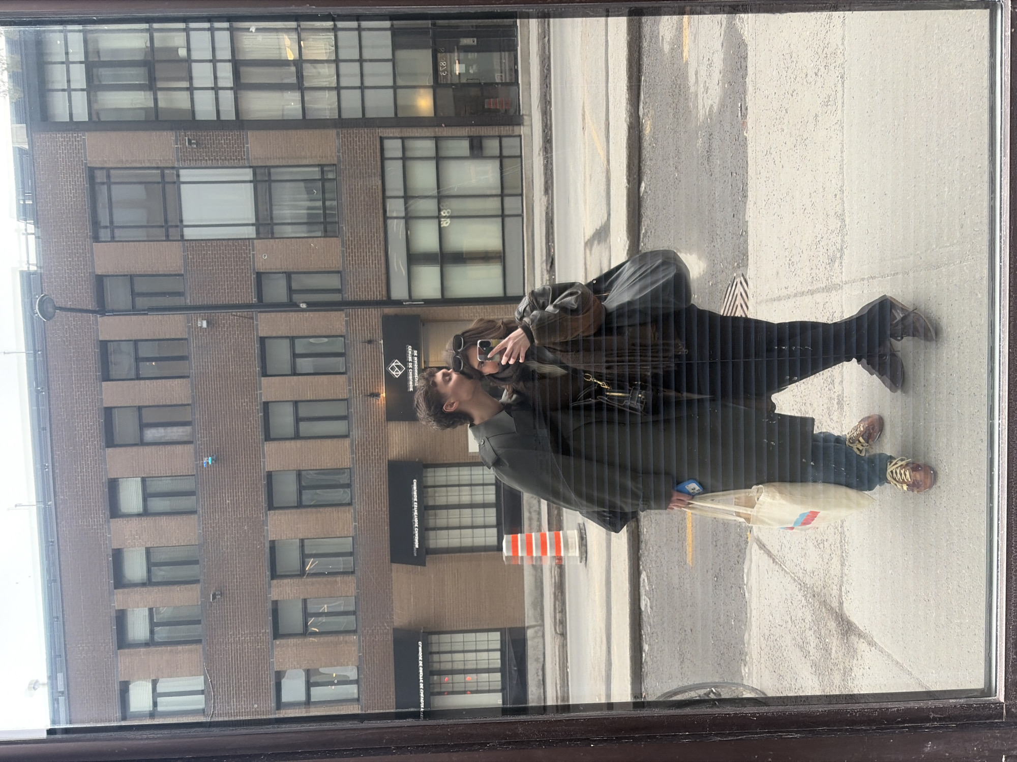 A reflection in a window shows two people taking a photograph in front of a brick building in Montreal, Canada