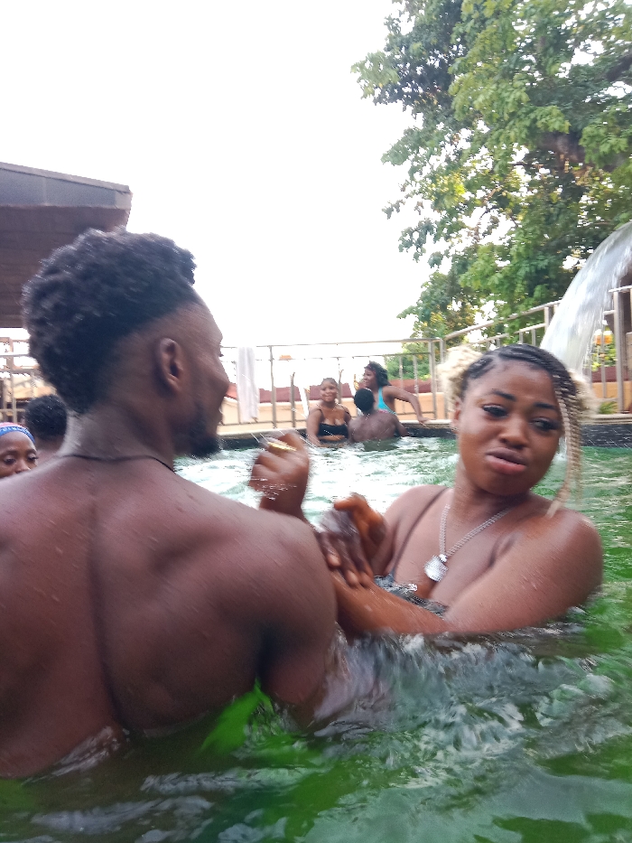 A group of people are enjoying a swimming pool with green water. A man with a high-top fade hairstyle and a well-defined back stands in the foreground facing left. A woman with blonde-streaked braids and a silver necklace looks at the camera while in the water. Other people are seen in the background, some near a waterfall feature. The pool is surrounded by a railing, and trees are visible in the upper right corner.