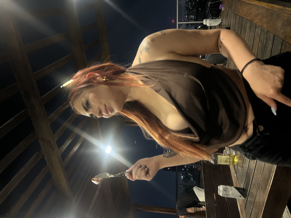 A woman with long red hair and a black top stands on a wooden deck at night. She holds a fork with food on it. In the background, city lights twinkle against the dark sky. There's a wooden structure overhead. A table in the foreground holds a can and a bottle. The woman has tattoos on her arms.