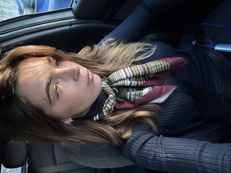 A lone adult female is depicted seated in what appears to be the passenger seat of a vehicle. The specific location within the city of Loures, Portugal, is not discernible from the image. The female, with light brown hair and bangs, is looking towards her right (viewer's left). Her visible left eye displays a prominent golden-orange reflection, indicative of direct sunlight. She wears a dark, possibly navy or black, ribbed turtleneck long-sleeved top. A square silk-like scarf is tied around her neck, featuring a striped pattern in shades of maroon, olive green, light green, and white. Small hoop earrings are present in both ears. A dark seatbelt is buckled across her chest and lap. A light blue cylindrical object, possibly a portable electronic device, with an attached dark blue cable, rests on the seat near her lap. The vehicle's interior is dark-toned. Strong, direct sunlight illuminates the left side of her face, hair, and forehead, creating stark contrast with the shadowed areas. A blurred blue object is visible through the window on the right side of the frame.