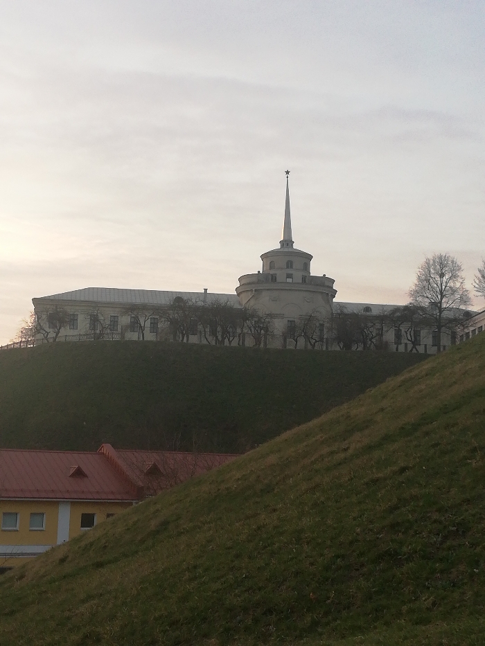 The image displays a prominent architectural structure located on a verdant hill in Hrodna, Belarus