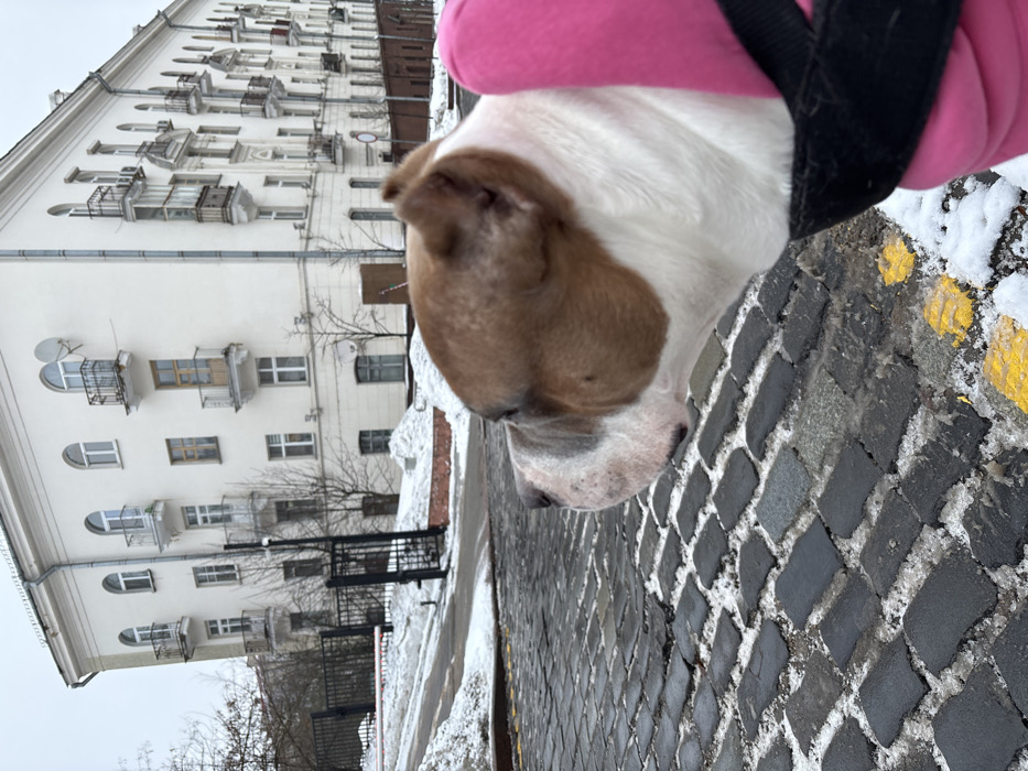 The image captures an urban street scene in Minsk, Belarus, under winter conditions. The primary subject in the foreground is the right profile of a brown and white American Bully type dog. The dog is outfitted in a bright pink garment, possibly a jacket, with a black harness strap visible underneath, and its head is turned towards the left of the frame. The ground consists of dark grey rectangular cobblestones, partially covered with white snow and ice. Yellow road markings are visible on the cobblestones in the lower right area. In the midground, a snow-covered paved incline ascends to the left, bordered by a black metal fence and gate system. Piles of snow are accumulated along the edges of the paved areas. The background is dominated by a multi-story, light-colored building, identified as Internatsionalnaya Street, 10, located near the intersection of Internatsionalnaya Street and Kirill and Mefodiy Street. This building exhibits classical architectural elements, including multiple arched windows and balconies fitted with ornate metal railings. Two satellite dishes are affixed to the upper left facade of the structure. Bare deciduous trees are present in front of and surrounding the building. The sky is overcast and uniformly light grey.