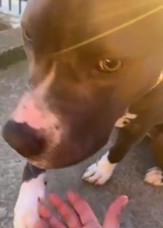 A dark-coated dog with white markings on its chest and paws sits outside, facing the camera. The dog has drool hanging from its mouth. A hand reaches up towards the dog. The scene is brightly lit by sunlight. Behind the dog is a metal railing and a planter.