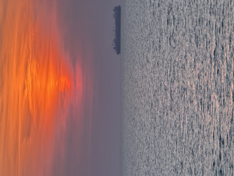 A panoramic view of the sea and sky at either sunrise or sunset, captured from the coast of Alexandroupolis, Greece. The upper portion of the frame features a sky dominated by vibrant orange and red hues, with the sun appearing as a distinct, luminous, circular orange-red disc centrally located in the upper half, partially veiled by horizontal cloud formations. Below the sky, the open water extends across the lower two-thirds of the image, presenting a subtly rippled surface reflecting ambient light. A dark, elongated vessel, consistent with a tanker or cargo ship, is silhouetted against the distant horizon on the right side of the frame. No human figures are discernible.