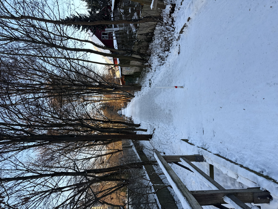 The image depicts a snow-covered pedestrian or cycling path in Berlin, Germany, on a clear winter day. The path extends straight into the distance, appearing narrower due to perspective, with a light dusting of snow covering a darker, potentially icy surface in the center. Tall, bare deciduous trees line both sides of the path, forming an overhead canopy. Golden sunlight illuminates the right side of the path and the tree trunks on that side, casting long shadows across the path from the left. On the left side of the foreground, a wooden railing, partially covered in snow, runs parallel to the path, bordering a lower area that features a metal fence and what appears to be a narrow channel or ditch. Further left, a chain-link fence runs along the path, behind which are more trees and distant structures. On the right side of the path, a single white post with a red band at its base stands in the snow. A low stone wall, also snow-dusted, separates the path from a private property. Behind this wall, a red house with a white gabled roof and white siding is visible, partially obscured by trees and other structures. No individuals are present in the scene.