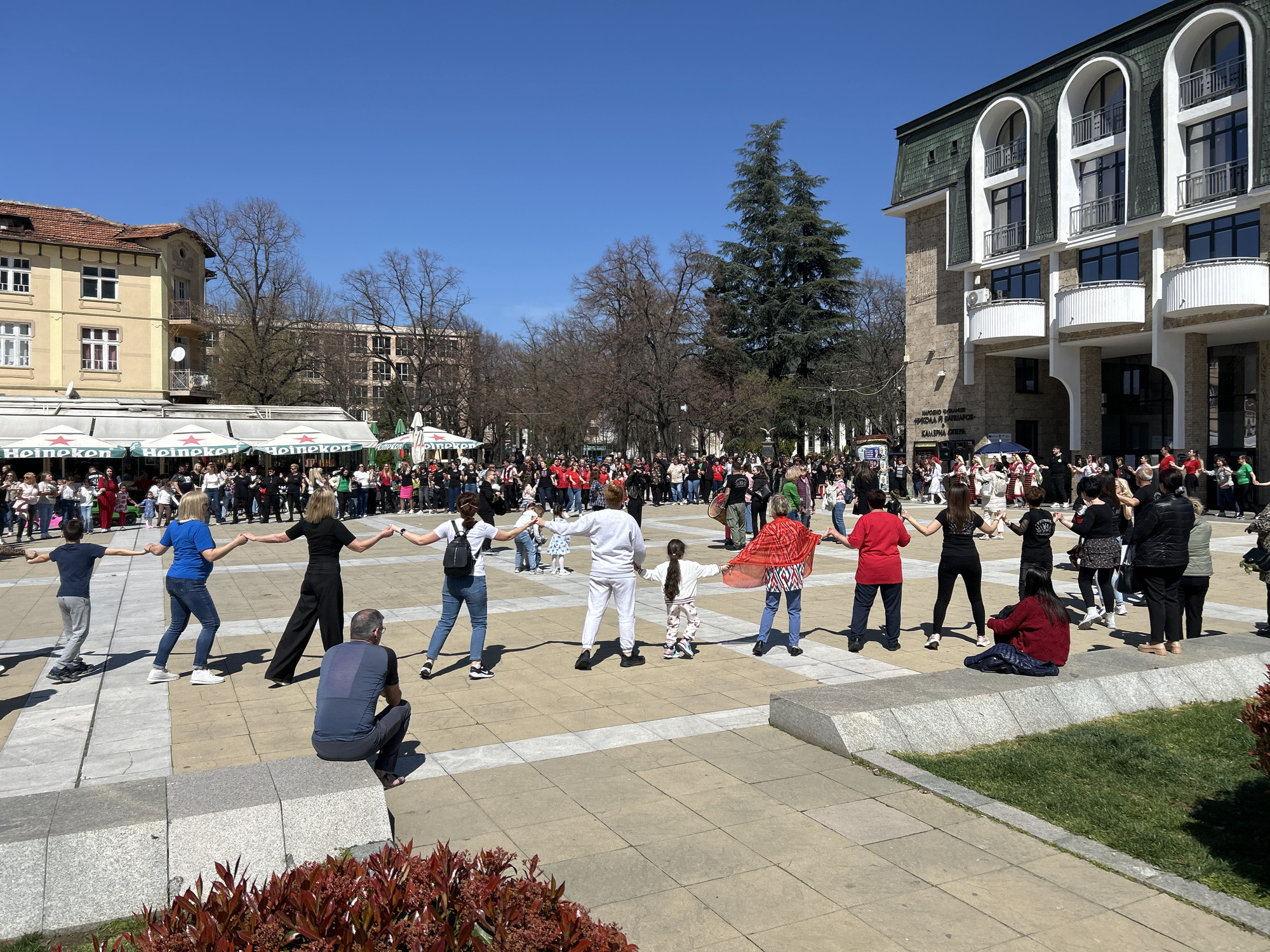 group of people participating in a horo, a traditional Balkan circle dance, on a paved square in Blagoevgrad, Bulgaria