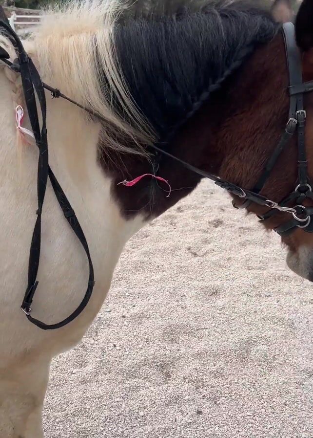 A horse and rider stand on a gravel-covered surface. The horse is a brown and white pony, with a black mane that is braided and a black bridle. The rider is wearing black riding pants and boots. The background includes a small red building, some trees, and a white fence.