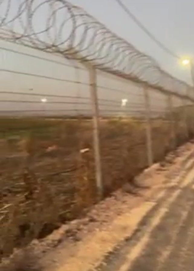 road beside a fenced area with razor wire. There are people, a red car, and several evenly spaced lights. The sky is light blue. The road is paved with dirt and tire tracks.