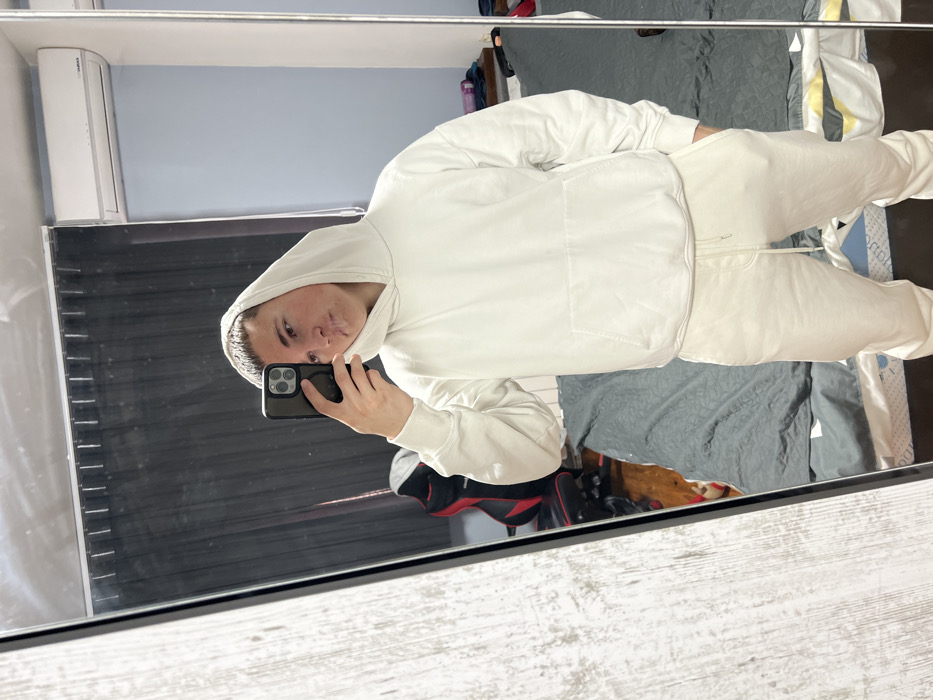 A young male is depicted taking a mirror selfie inside a room, identified as being in Botevgrad, Bulgaria. He is wearing a plain white hooded sweatshirt and matching white sweatpants. His short, dark hair is visible, and he holds a dark-colored smartphone, likely an iPhone, in his right hand to capture the image. A small, white cylindrical object is positioned between his lips, from which a wisp of vapor or smoke is discernible. His left hand is placed within the pocket of his sweatpants. The room's reflection in the mirror reveals a gaming chair with black and red accents on the left. A bed covered with a dark grey comforter or duvet is situated in the background. To the right, a light blue wall is visible, with a white air conditioning unit mounted near the ceiling. Dark curtains or blinds are present above the bed. The mirror itself has a thin, dark frame, and to the immediate left, a portion of a textured, light-colored wall is visible.