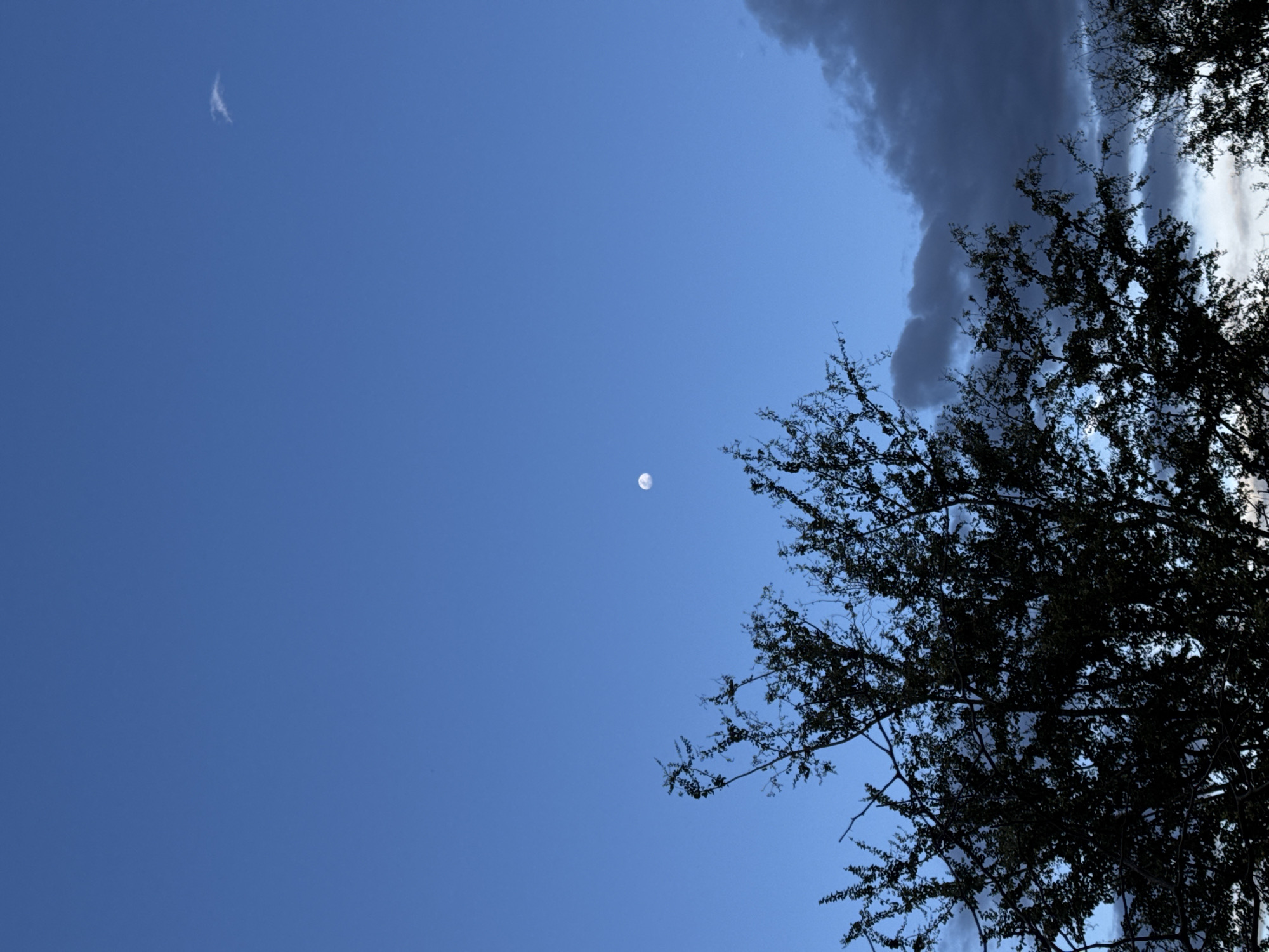 The image captures a scene in Oaxaca City, Mexico, with a bright blue sky dominating the view. A faint crescent moon is visible in the upper left corner of the frame, while a full moon is centrally positioned. A large, dark, and stormy cloud occupies the upper right portion of the image, partially obscured by the silhouette of a tree with dense foliage. The composition is primarily focused on the sky and the contrasting elements of the moon, clouds, and tree.