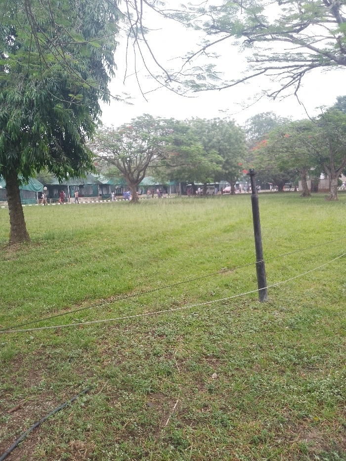 This image depicts an outdoor grassy area in Ota, Nigeria, under an overcast sky