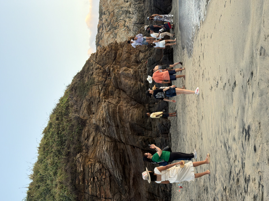 A group of people stand on a sandy beach beside a rocky cliff. Some are on the rocks near the water's edge, and others are spaced out along the beach. They appear to be a mix of ages and are dressed in casual clothing. One woman in a white dress and hat stands in the foreground. The sky is visible in the upper left corner.