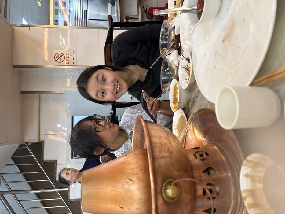 The image depicts an indoor scene within a casual Chinese restaurant, located in Xicheng District, China. Three individuals are visible. In the foreground and mid-ground, two young Asian females are seated at a marble-patterned dining table. The female on the left, wearing glasses and a plaid shirt, looks towards the right while holding a smartphone. The female on the right, wearing a black top, smiles directly at the camera while also holding a smartphone. A large, patinated copper hotpot occupies the left side of the table, partially obscuring the left female. The table surface is cluttered with various used dining items, including multiple small white bowls containing remnants of food or sauce (e.g., red chili paste, beige powder), clear glass bowls, white plates, chopsticks, and metal spoons. A small white porcelain cup is positioned in the immediate foreground. In the background, an adult Asian female, possibly a restaurant employee, stands near a light-colored staircase on the left. The restaurant walls are primarily white tiles. A prominent red and white "NO SMOKING" sign, featuring Chinese characters (禁止吸烟) and a complaint telephone number (投诉举报电话: 12345), is mounted on the wall to the right of the seated individuals. Additional restaurant equipment, including commercial refrigeration units and a red fire extinguisher, are visible on the far right. The overall environment is brightly lit.