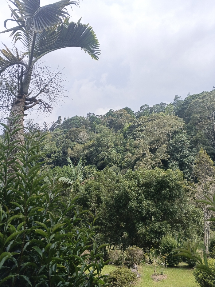 The image depicts a verdant, mountainous landscape in Tamghas, Nepal, under an overcast sky. The upper two-fifths of the frame shows a light gray, cloudy sky. In the foreground, positioned on the left, is the trunk of a tall palm tree with distinctive, fan-shaped fronds extending into the upper left corner. Below this palm and extending across the lower left are numerous unfocused, vibrant green leaves and branches of dense shrubbery or smaller plants. The midground and background are dominated by a steep, densely forested hillside, comprising a thick canopy of various broadleaf trees in multiple shades of green. At the lower right, a patch of cultivated green grass is visible, interspersed with smaller bushes and shrubs, suggesting a landscaped area at the base of the hill. No human figures, animals, or artificial structures are present.