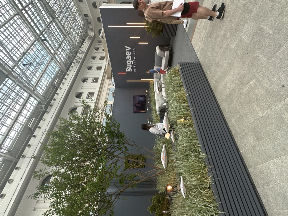 display area with the name "Bugaev parks & gardens" in white letters on a dark gray wall. The display features a variety of plants, including a large tree with green leaves, a small bush in a container, and tall, green grasses. There are several circular metal planters containing low-growing green plants and a few reflective circular objects. The display also includes a television on the wall with a screen showing a green background with a large leafy plant. Three chairs and a couch are situated in the center of the display area. A person in a light-colored top is standing in the foreground of the display looking in the direction of a second person standing outside of the display area. This person is wearing a beige top with a brown belt, blue jeans, and a black backpack. A third person wearing a red t-shirt and red shorts with black sandals is standing in front of the display area looking at a small piece of paper. The image was taken in the atrium of the GUM department store, which is located at the coordinates 55.754, 37.627 in Moskva, Russia. The location appears to be an indoor space with a glass ceiling. The flooring is light-colored tile. The image was taken during the day, and the lighting is bright. The background of the image is a white building with large windows and a glass ceiling. The white building is in the distance, and the display area is in the foreground. The overall tone of the image is calming and peaceful. The colors are muted and natural. The image is well-composed and balanced. The display area is inviting and interesting. The image is well-lit, and the focus is sharp.