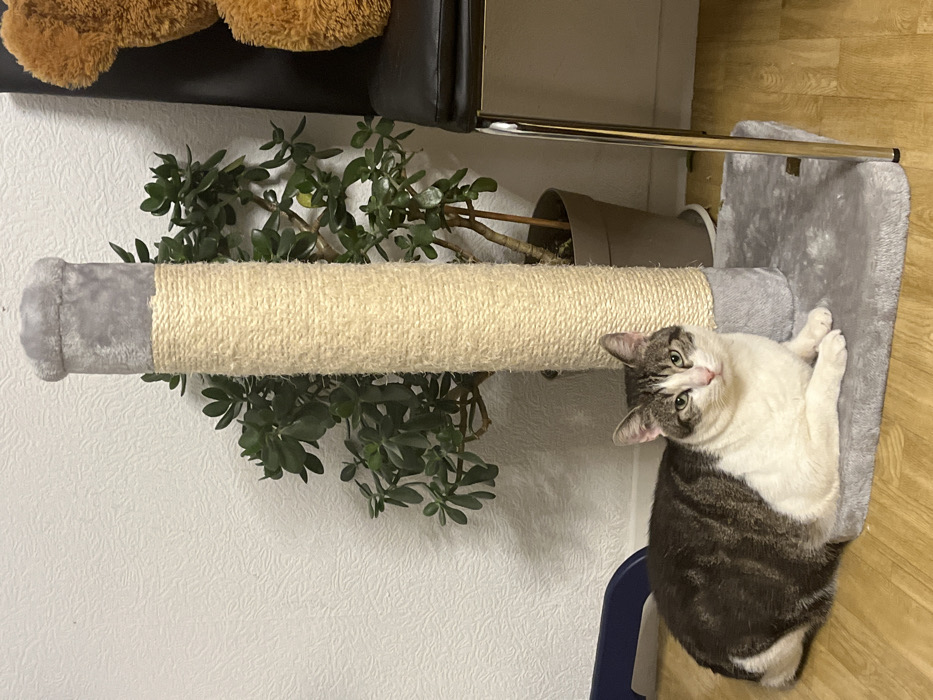 A gray and white tabby cat reclines on a gray cat tree platform. The cat gazes upward with wide eyes. A scratching post covered in tan rope extends horizontally to the left. A potted jade plant with lush green leaves is positioned behind the scratching post and near the cat tree. A dark brown teddy bear is partially visible at the top left. The background consists of a white wall and light brown flooring. A blue chair is partially visible underneath the cat.