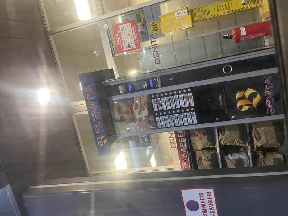 The image captures a commercial scene from a slightly elevated perspective, likely through a vehicle window, in the city of Byala, Bulgaria. The primary subject is a tall, black and silver "BENITA" branded hot beverage vending machine positioned outside a storefront. The machine features a large advertisement of a blonde woman holding a white cup. Multiple selection buttons for various drinks (e.g., espresso, cappuccino, tea) are visible, with prices ranging from 0.50 to 0.60 Bulgarian Leva. Behind the vending machine, visible through the glass facade of the building, are shelves stocked with multiple large, brown bags identified by Bulgarian text as "БАРБЕКЮ" (BBQ) and "Въглища" (Charcoal). Another "BENITA" sign is visible inside the store. To the left of the vending machine, partially obscured, is a red and white circular sign indicating "СПИРАНЕТО ЗАБРАНЕНО!" (Stopping Forbidden!). To the right of the vending machine, also seen through the glass, is a red sign with "KACA" (Cashier) and logos for payment options including A1, VIVACOM, EVN, and Cashterminal. Below this, a yellow display stand with the prominent number "444" and text regarding "444 prizes propane butane fuels" is present. A red fire extinguisher stands on the ground next to the yellow display. Overhead, bright light sources are reflected in the glass, indicating indoor lighting or a covered area.