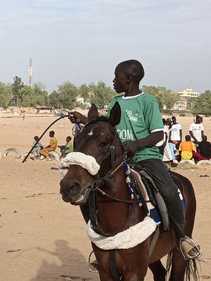 A young, dark-skinned boy in a green t-shirt rides a brown horse with decorative white fringes on its bridle and saddle. The boy holds a thin whip and looks towards the left of the frame. The horse stands in a sandy field. In the background, other people are seated on tires, wearing various colored shirts. A communication tower is visible further in the distance, along with trees and buildings under a bright sky.