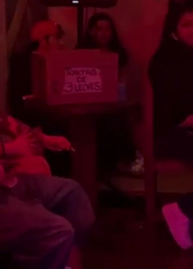 In a dimly lit, possibly indoor setting, tinged with red light, several people are visible, some sitting and some standing. A small round table stands in the middle ground, upon which sits a cardboard box labeled "TORTAS DE 3 LECHES!" in pink lettering. A person wearing a red baseball cap is seated behind the table, partially obscured by the box. Other individuals are standing or sitting around the table, one of whom is holding what appears to be a cigarette. A speaker is visible above the table, and general movement and conversation seem to be taking place amongst the group, giving the impression of a social gathering.