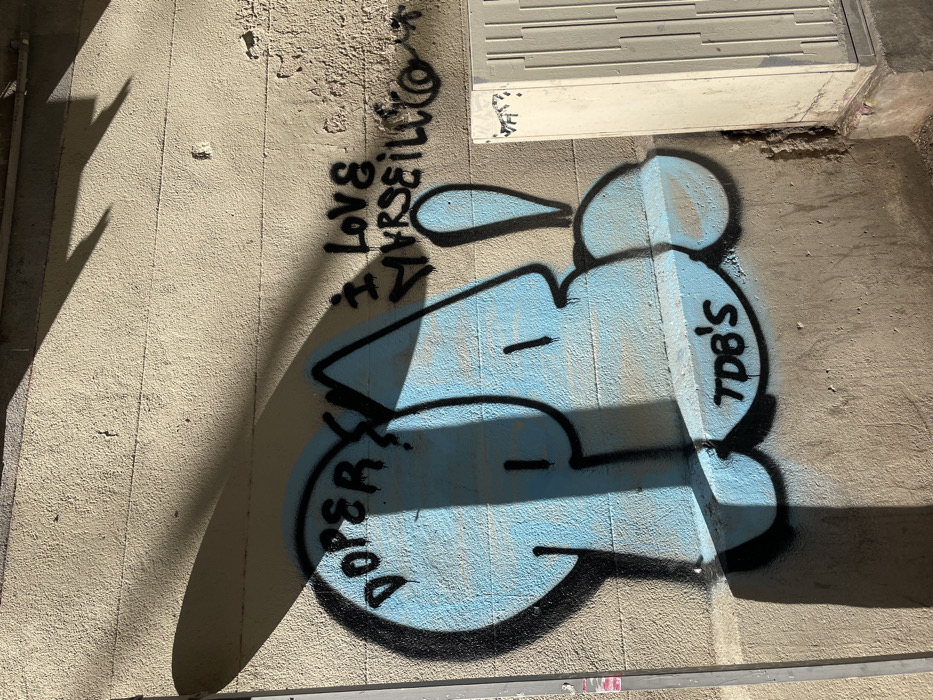 The image displays a graffiti-covered wall in Marseille, France