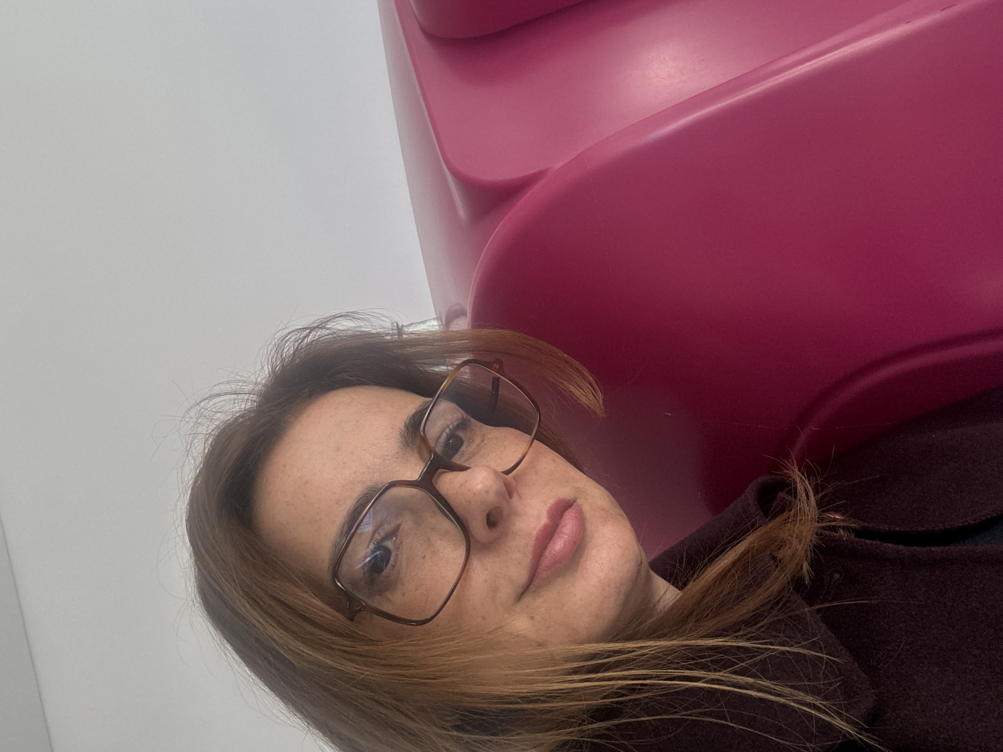 An indoor scene features a female individual, approximately mid-adult, occupying the left half of the frame. She has light brown hair, a fair complexion with freckles, and wears large, dark-framed eyeglasses. Her lips are a light pink, and she gazes directly at the camera. She is dressed in a dark, possibly burgundy or deep purple, textured coat with a visible collar. The background on the upper right is a plain white surface. To her right and behind her is a prominent, curved structure rendered in a vibrant magenta color, featuring smooth, molded contours, consistent with a modern seating element or interior design feature. The specific location within Torres Vedras, Portugal, is not visually identifiable from the image content.