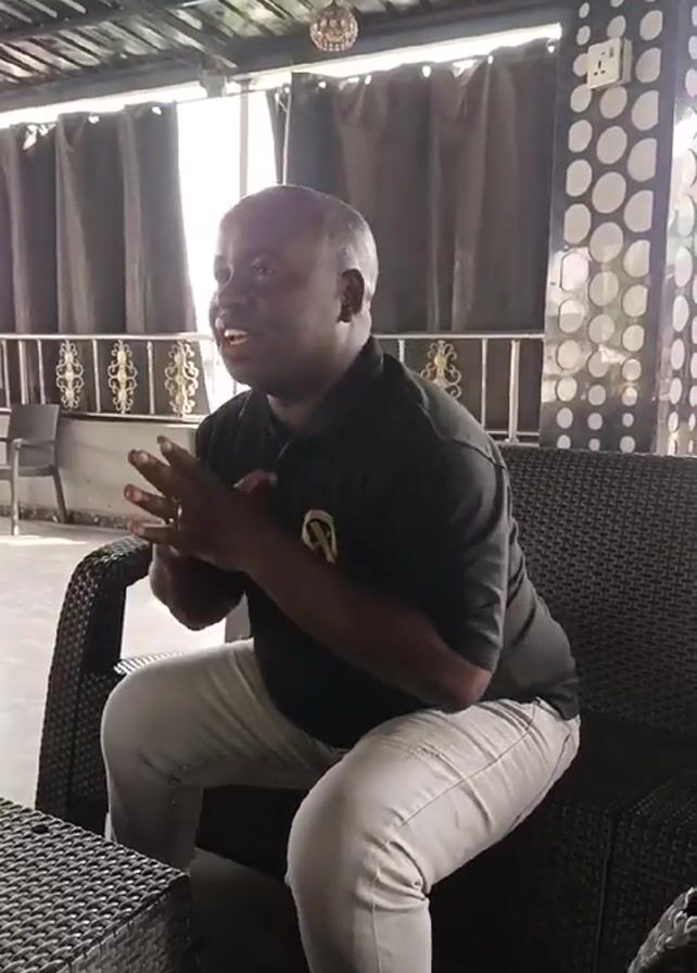 A man is sitting on a rattan sofa indoors, his hands clasped in front of him. He is wearing a black polo shirt and light gray pants. The scene has black curtains, rattan furniture, and an overhead light fixture. The man is looking towards the right and speaking.
