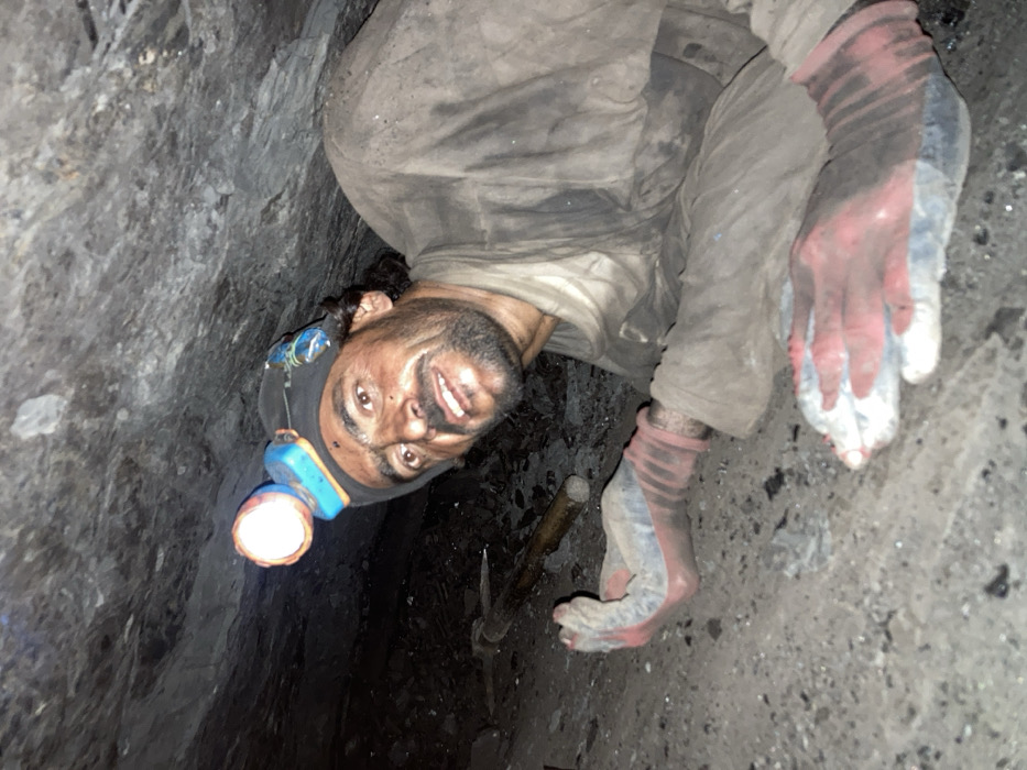 Inside a narrow, dimly lit mine shaft in Duki, Pakistan, a male miner, appearing in his 30s or 40s, is captured in a prone or crawling position
