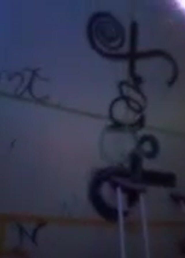 Here is a detailed description of the video: The video shows a wall with the word "trust" written vertically in a stylized, script-like font. To the left of "trust" and slightly above it, there is some additional writing that is not fully legible, appearing to start with "umt". The wall appears to be a light color, possibly pale pink or off-white. Below the word "trust," there are two crutches leaning against the wall. This suggests that someone using the crutches may have written or otherwise interacted with the wall. Above the word "trust," along the top edge of the wall, there's a string of lights, some of which are glowing with a blue-green hue. The overall lighting is somewhat dim, but the string of lights and the light color of the wall make the scene visible. The camera angle is from below, looking upwards at the wall, and the focus is primarily on the word "trust." The video appears to be taken indoors. The voiceover states that the speaker cannot finish a mural because they are on bed rest due to a broken foot.