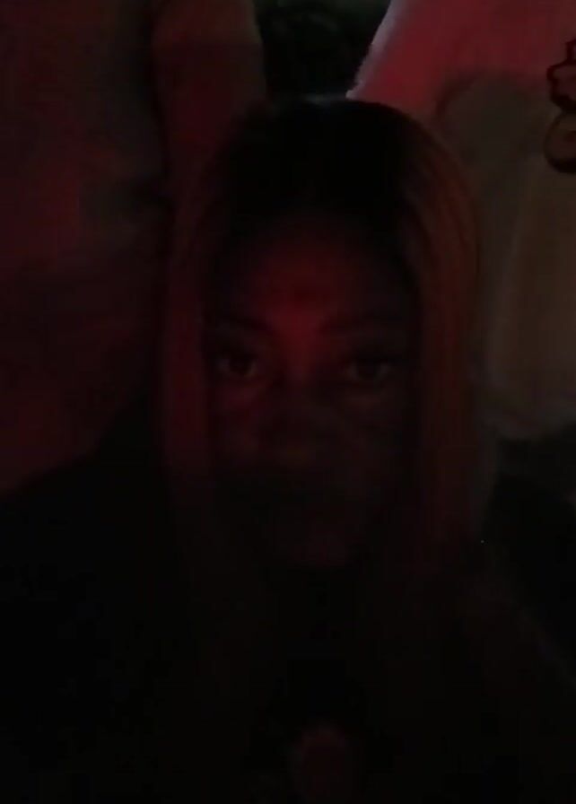 A dimly lit, blurry video shows a person with light brown hair looking directly at the camera