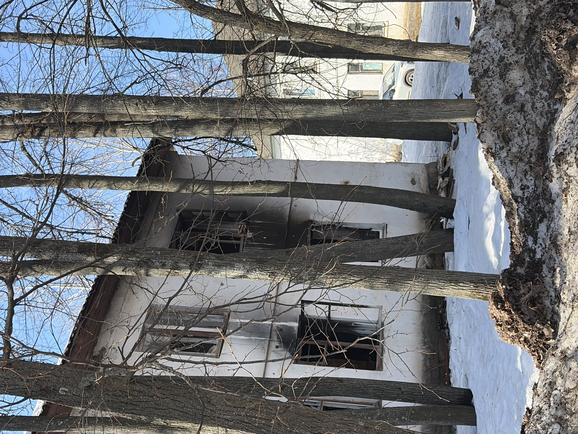 The scene depicts an outdoor urban environment in Chaikovsky, Russia, under a clear blue sky. The primary subject is a two-story building with a light-colored facade, exhibiting significant fire damage. Extensive black soot streaks vertically mar the building's exterior, particularly between the first and second floors, originating from multiple windows. The windows on both levels of the visible facade are devoid of glass, and their frames appear charred and damaged. A dark, pitched roof with a wooden overhang is partially visible. Numerous tall, bare deciduous trees with light gray trunks are positioned prominently in the foreground and midground, partially obscuring the fire-damaged building. The ground is covered by an uneven layer of melting snow, interspersed with patches of dirt and debris, including a distinct mound in the immediate foreground. In the background, another two-story white building with a dark roof is visible, in front of which a light-colored sedan or small SUV is partially parked. No individuals or active events are present in the image.
