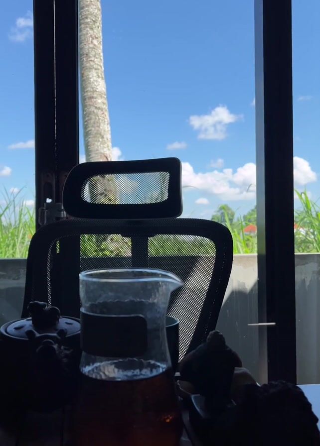 The scene is set indoors, looking out of a window. A tall palm tree and a blue sky dotted with white clouds are visible through the window, alongside green grass. In front of the window, a black mesh office chair is positioned, facing the view. On a table in the foreground, there is a tea set which includes a black teapot, a glass carafe filled with a dark liquid, and a dark-colored platter with items that are hard to distinguish. The lighting is dim in the foreground, creating a silhouette effect for the objects, while the outdoor scene is brightly lit.