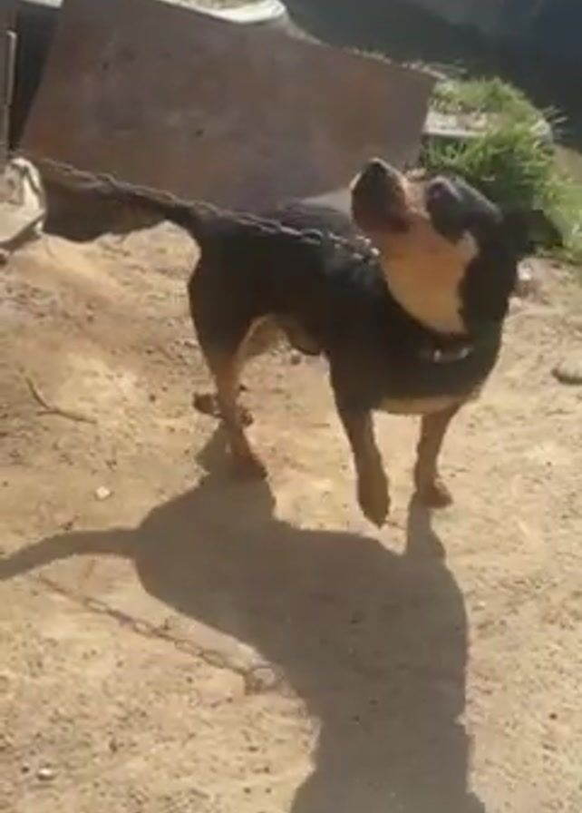 medium-sized dog with a short, black coat and tan markings on its legs and face. The dog is standing on a dirt surface under bright sunlight. It is wearing a collar and is leashed. In the background, there's a sheet of metal and some green vegetation. The dog is alert and looking around.