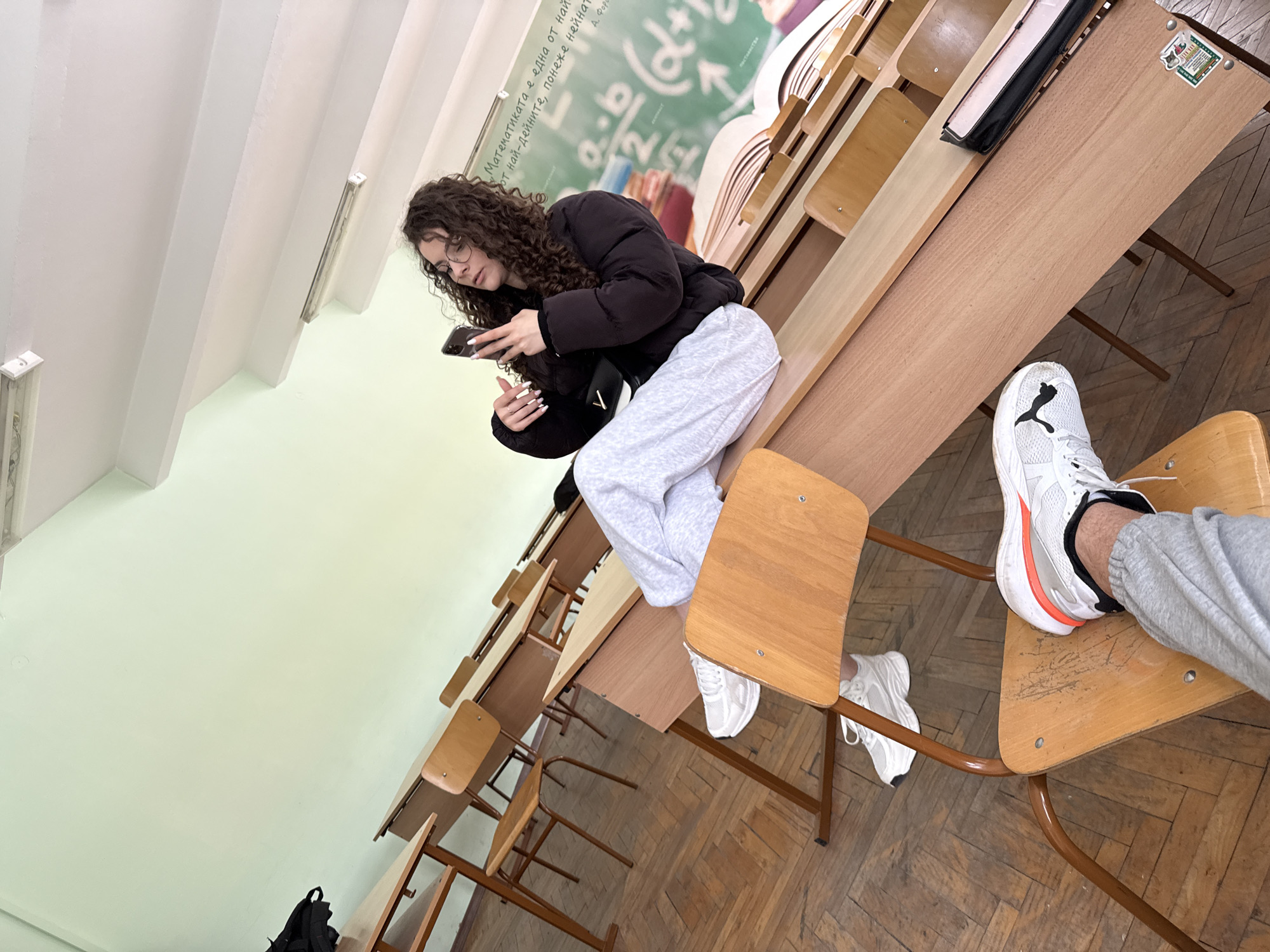 young woman sitting on a school desk, looking at her phone. She is wearing glasses, a black puffy jacket, and gray sweatpants. Another person's leg is resting on a chair in the foreground. The background includes rows of desks and chairs in a classroom setting. A chalkboard with mathematical equations is visible on the back wall. The location is possibly a school in Peshtera, Bulgaria, based on the text on the chalkboard.