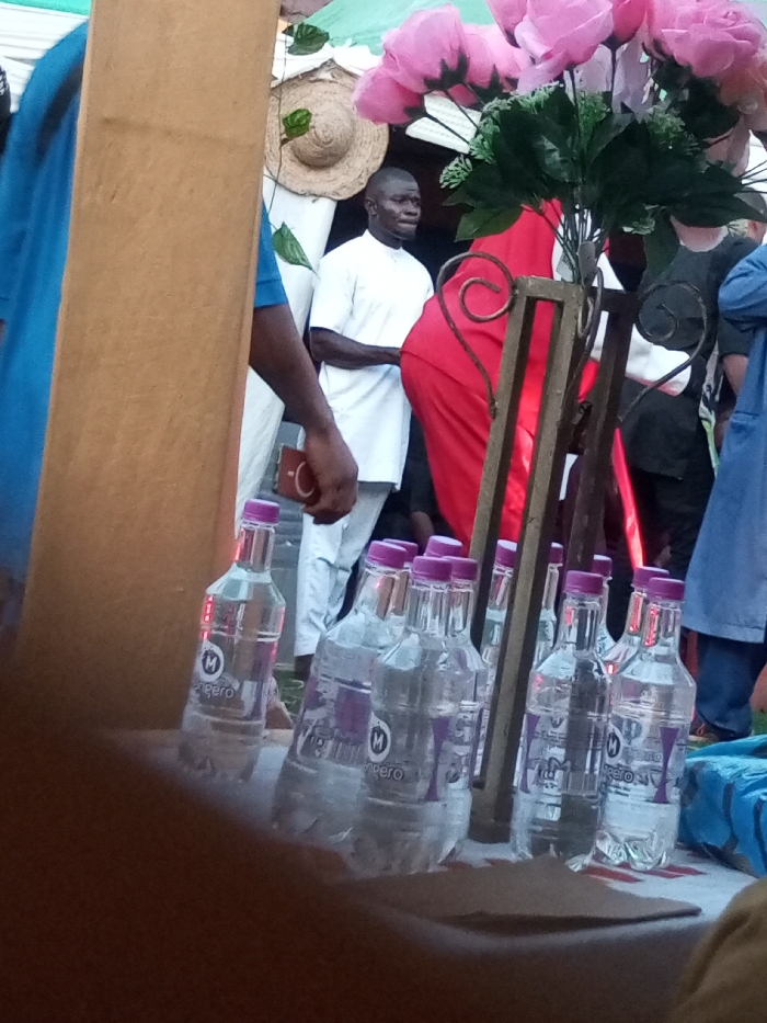 The scene in Amokvo, Nigeria, depicts a gathering, possibly an event, with multiple individuals and decorative elements. In the immediate foreground, a blurred, dark brown surface occupies the lower portion of the frame. On this surface, a collection of at least ten plastic water bottles, labeled "Mpero" with purple branding and purple screw caps, are arranged. To the left, a thick, light brown vertical column or pillar partially obstructs the view. Behind the bottles and column, a dark metal stand with scrollwork, including heart-shaped motifs, supports a large artificial floral arrangement featuring multiple oversized pink roses and green foliage. Several individuals are visible in the midground. A dark-skinned man with short dark hair stands prominently in the center-left, wearing a white tunic-style shirt with a collar and white trousers. His hands are clasped in front of him, and he gazes towards the right of the frame. To his left, a person wearing a vibrant red garment, possibly a wrapper or dress, is partially visible from the waist down, facing away. To the man's right, a person in a blue top is partially visible, with their right forearm and hand, holding a small brown rectangular object, visible near the water bottles. Further to the right, another individual wearing a blue garment is partially obscured. In the background, a light-colored straw hat decorated with green leaves is suspended on a wall or structure. Overlapping fabric, appearing as light green and white canopy material, is visible at the top of the frame, suggesting an outdoor or semi-outdoor event setting. The overall lighting suggests daylight conditions.