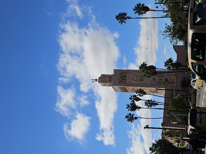 A tall brick tower with intricate designs stands prominently against a blue sky dotted with puffy white clouds. Palm trees line the streets, adding a tropical touch to the urban scene. Yellow taxi cabs are parked alongside the road, near the tower. The photograph captures the juxtaposition of architectural grandeur and everyday city life.