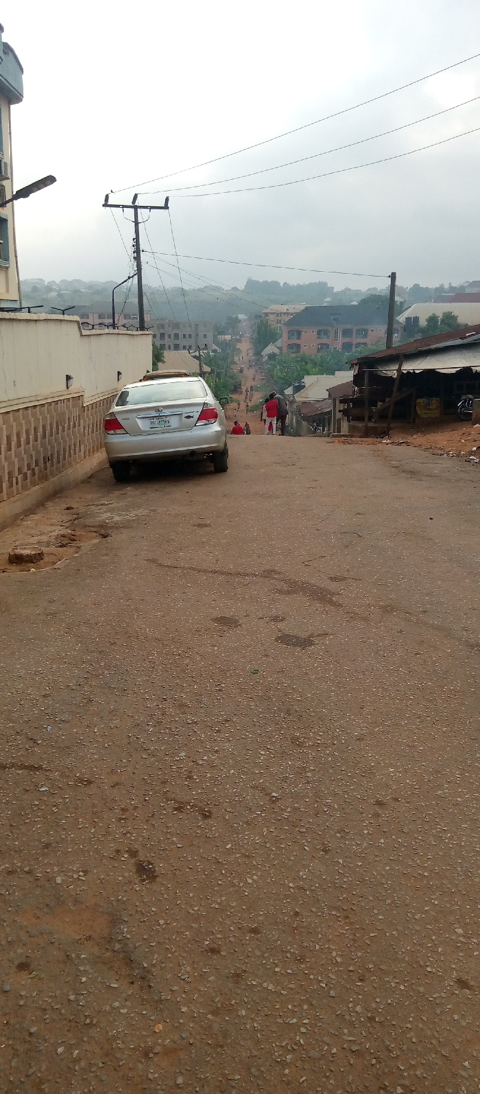 The image depicts a downward-sloping, unpaved road in Nsugbe, Nigeria, under an overcast sky