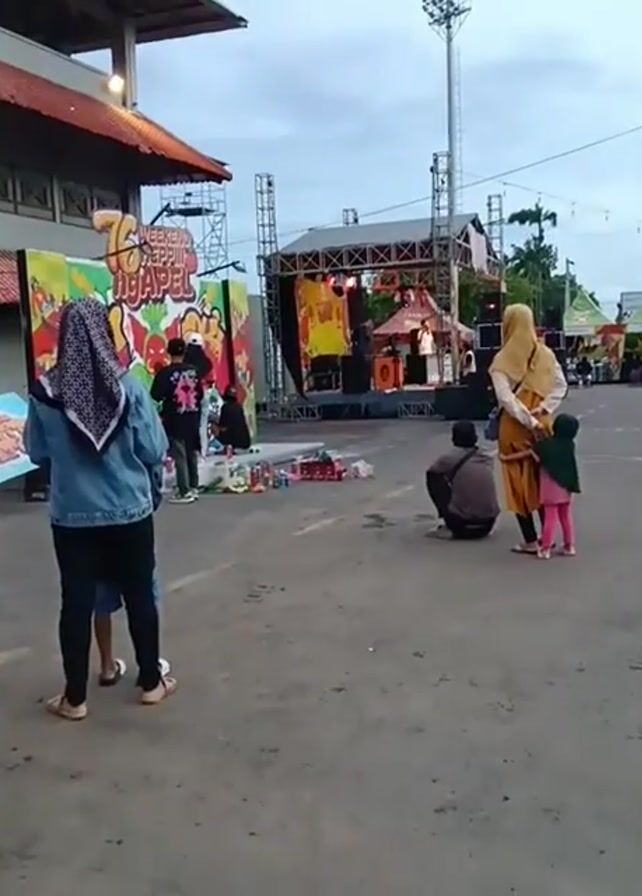 public event taking place in an open space, possibly a parking lot or plaza. In the foreground, two adults, one with a child, are standing and watching a stage where a band or performer is set up. To the left, another adult and child are looking at a display, possibly a vendor's stall. A man is crouched on the ground nearby. In the background, there are tents or stalls suggesting a market or festival atmosphere. The sky is overcast, indicating that the event is taking place in the late afternoon or early evening. The banner with "WEEKEND SEPPUH NGAPEL" is also visible.