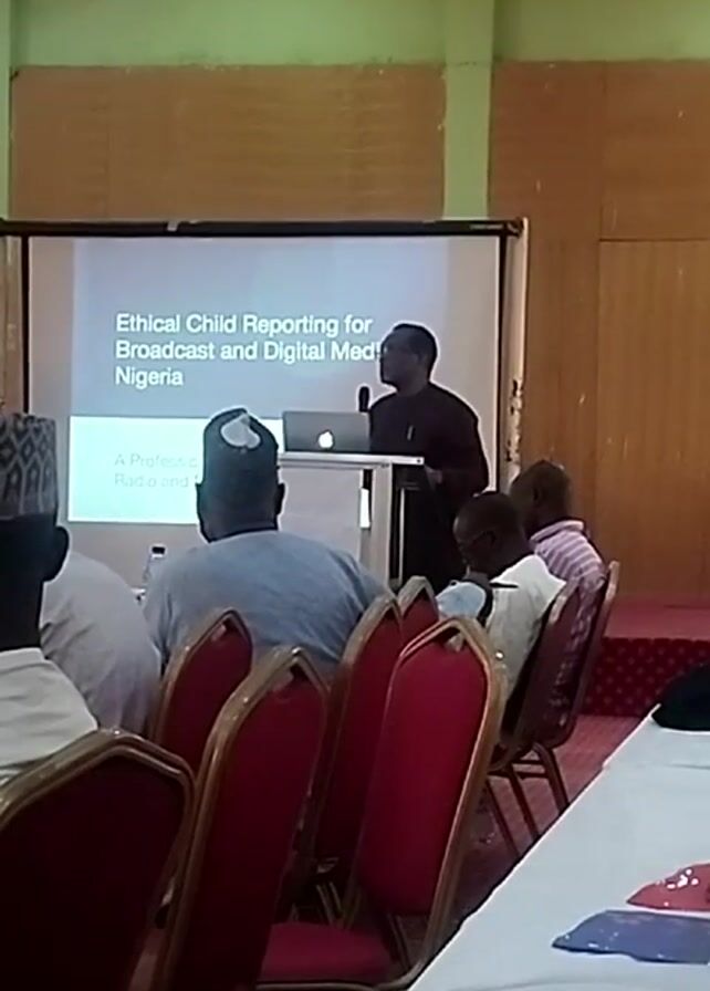 A man in a dark-colored suit stands at a podium, delivering a presentation to an audience. The presentation is projected onto a screen behind him, titled "Ethical Child Reporting for Broadcast and Digital Media: Nigeria". The podium has a laptop on it. Several audience members are visible, seated in red chairs around a long white table. The room is decorated in light green and beige.