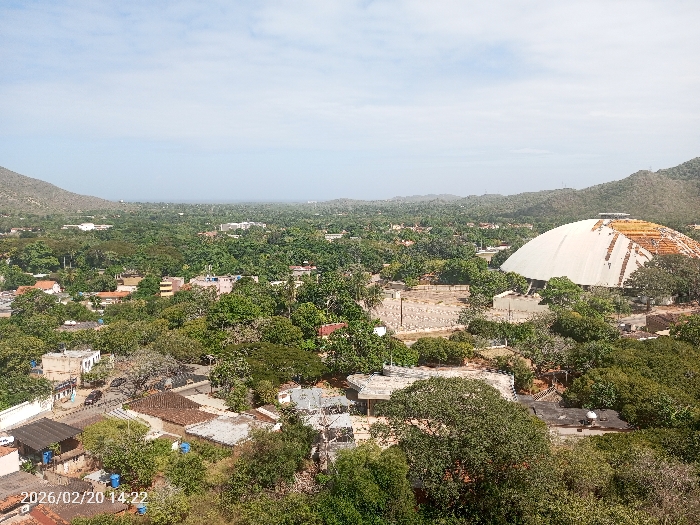 A cityscape with mountains in the background is shown. The city is surrounded by lush trees. There's a large, white dome-shaped building with some construction or damage on its top right. The date "2026/02/20 14:22" is printed in the bottom left corner. The sky is bright with a hint of cloud cover.