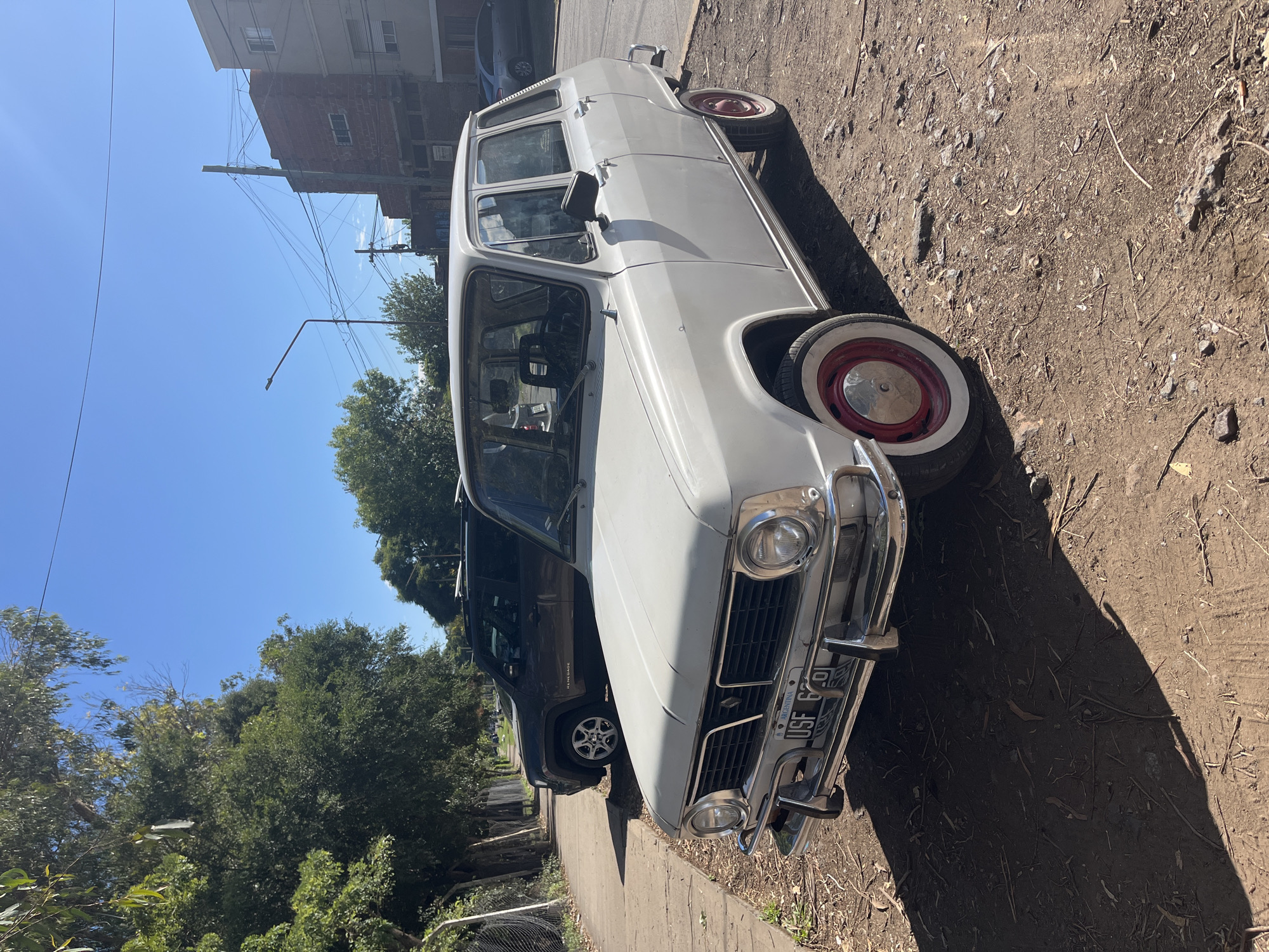 - "A white vintage sedan, possibly a Renault 6, is parked on a dirt and gravel shoulder on the right side of a paved street in Quilmes Oeste, Argentina, under a clear blue sky" by FM-r36Gp1, licensed under CC BY 4.0
