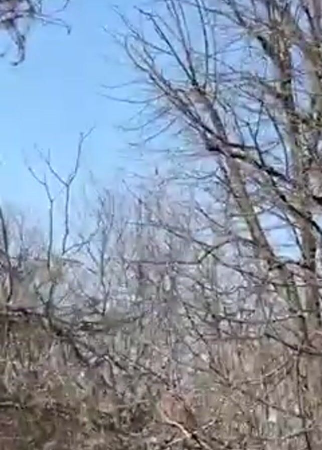 The video begins with a shot of a clear, light blue sky visible through leafless branches of trees. The camera then pans downward, revealing a dense thicket of bare trees and brush. The final portion of the video focuses on the ground, which appears to be covered with gravel and small debris.