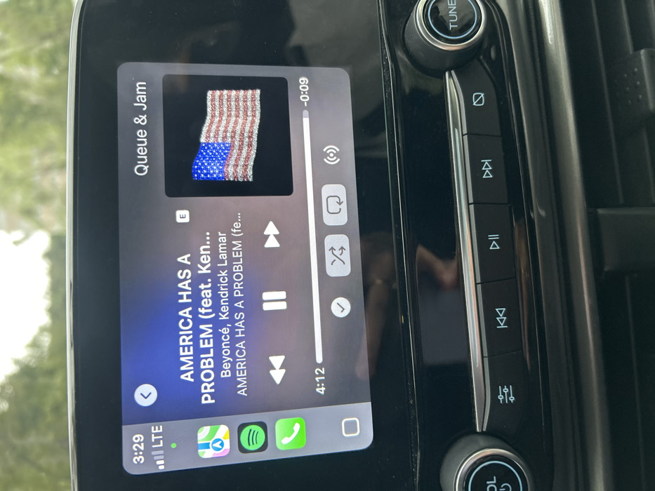 The image depicts the interior of a vehicle in Mexico City, Mexico, focusing on the car's infotainment system, which is displaying Apple CarPlay. The screen shows the music track "AMERICA HAS A PROBLEM" by Beyoncé, featuring Kendrick Lamar. The album art is visible on the right, presenting a three-dimensional, waving American flag composed of a reflective, textured material. The music playback interface indicates the track has played for 4 minutes and 12 seconds, with 9 seconds remaining, and is currently paused. The upper-left corner of the screen displays the time as 3:29 and a full LTE cellular signal. Below this, app icons for Maps, Spotify, and Phone are visible. Control icons for previous track, pause, next track, add to library, shuffle, repeat, and AirPlay/casting are present on the lower portion of the music display. Below the screen, a section of the vehicle's dashboard is visible, featuring physical buttons for media control, including equalizer settings, skip backward, play/pause, and skip forward. A rotary knob labeled "VOL" (volume) is partially visible on the left, and a "TUNE" knob is on the right. Reflections of a person's upper body, including an arm and hand, are discernable on the screen's surface. The background visible through the windshield consists of blurred green foliage, indicating an outdoor, daytime setting.